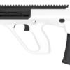 This firearm is chambered in 223 Rem/5.56 NATO, has a 16″ barrel with a black metal finish, a white synthetic stock, and has a extended rail for optics.