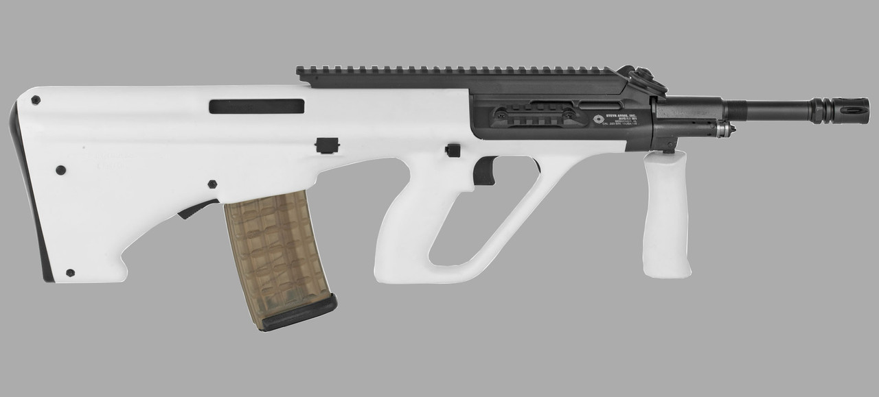 The iconic bullpup-style Steyr AUG has been one of the most recognizable rifles in the world since its adoption by the Austrian army in 1977 and is now available for civilian use as the Steyr AUG A3 M1. The short-stroke gas-piston operation of the AUG runs exceptionally cleaner by nature because all of the operational exhaust gas vents out of the front of the rifle. The AUG A3 M1 has all the classic features and benefits that established it as the pinnacle of modern rifle design. It also features a quick-change barrel with a collapsible forward grip as well as a two-position cross-bolt safety that locks the trigger.
