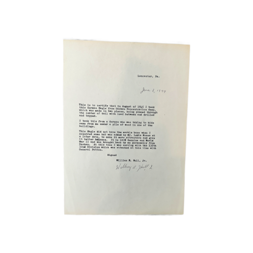 “Very Rare” Certified Original, WW2 German Third Reich Bronze Eagle From Dachau Concentration Camp brought back in 1945 by William A. Hull Jr serving with the 135th 32nd Division that was attached to General Pattons 3rd Army in Germany. It was taken from a German who was trying to hide it under a pile of wood in one of the Dachau camp buildings. This bronze eagle made in two pieces, being pinned though the center of the tail with lead between and drilled and tapped. This Eagle did not have the marble base when it was acquired but was added by Mr. Lewis Moses on a later date. The eagle is made of solid iron and bronze coated. The eagle measures 6 inches without the marble base. With the base the total messurment is just short of 7 inches. The condition of this historical relic is near mint. This solider bring-back includes a signed letter and newspaper clipings from William A. Hull Jr of Lancaster Pennsylvania dated June 8, 1977 who was a 32-year district justice.