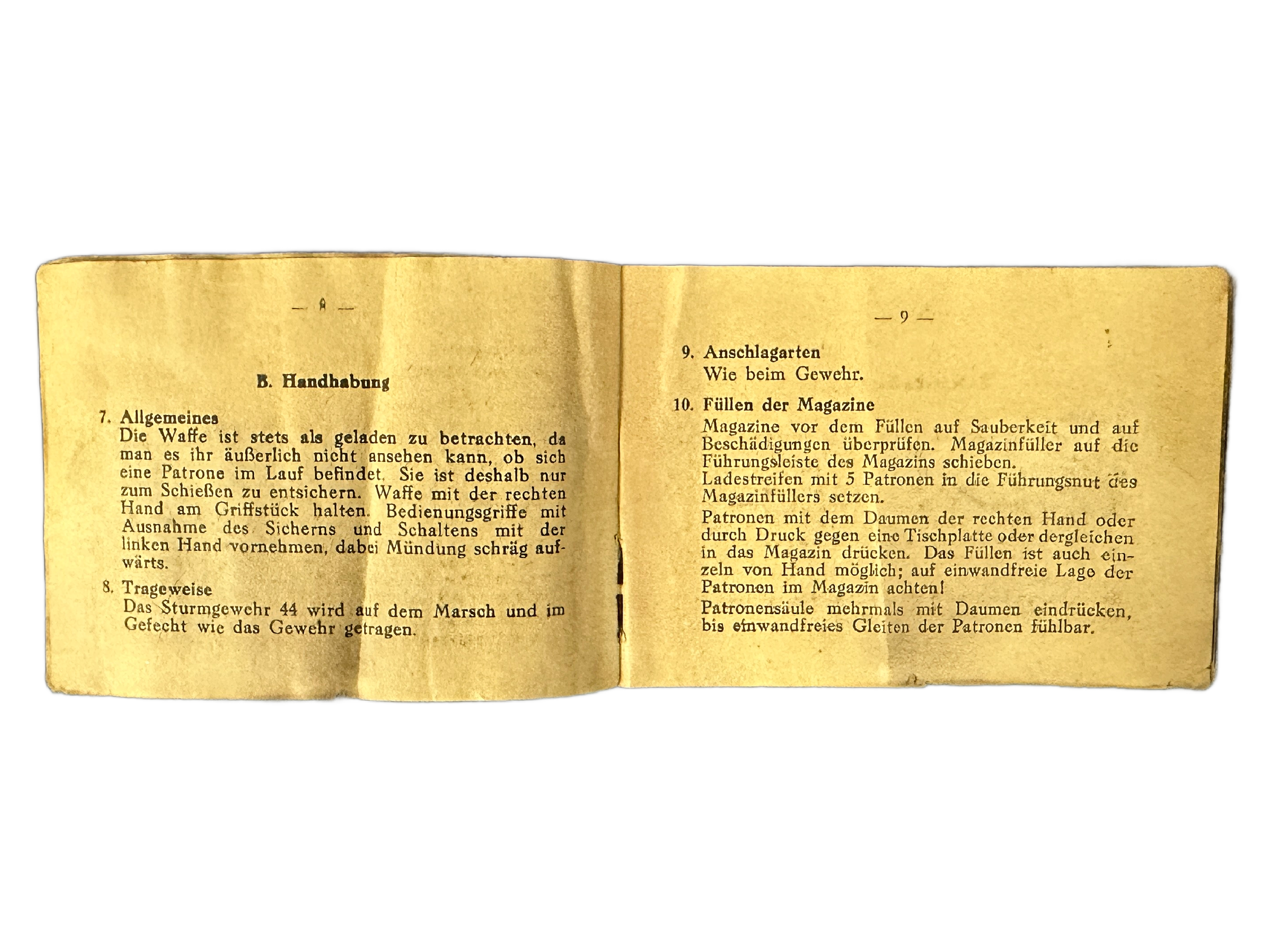 This original “very rare” original stg44 sturmgewehr butt stock field manual. Every rifle was issued with one in the buttstock for soldiers in the field. The manual is oil stained and fairly worn, with delicate pages. All pages are intact and only the front cover page is ripped, but slightly. There are 15 pages, and the manual is dated 1944.