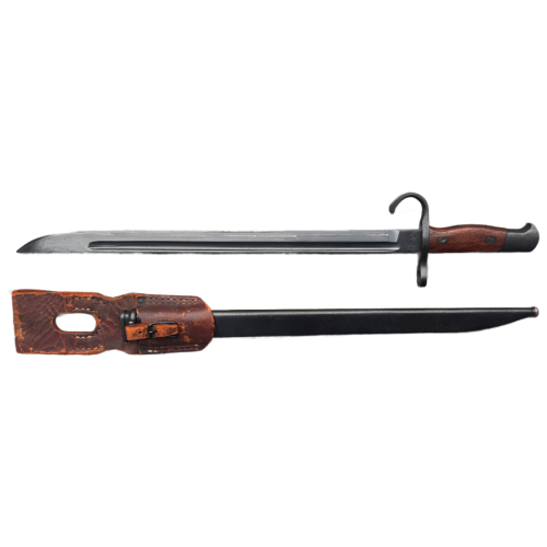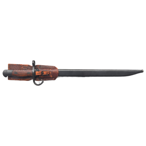 The scabbard for the Type 30 bayonet typically had a wood core with a metal throat and chape. It was designed to protect the blade and allow the bayonet to be carried safely. Some scabbards also had a metal or leather belt frog, which allowed the bayonet to be attached to the soldier’s belt for easy access.