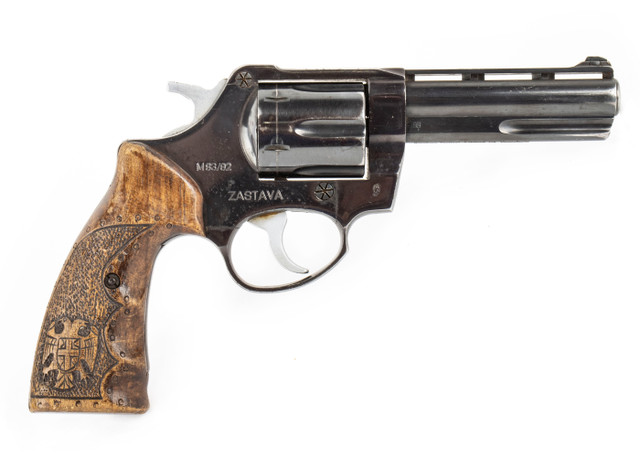 The Zastava M83 is a .357 Magnum revolver originally designed by Crvena Zastava for export and later issued to Yugoslavian military NCOs and police forces in the late 1980s. This six-shot, double-action revolver features a 4-inch blued barrel, side-opening cylinder, exposed hammer, and a frame-mounted firing pin with an automatic transfer bar safety. Chambered in .357 Magnum, it also fires .38 Special.