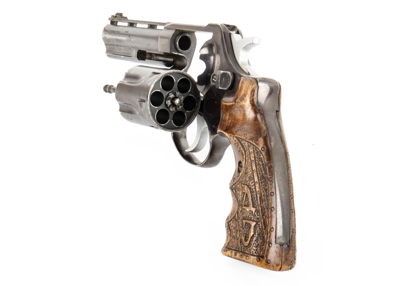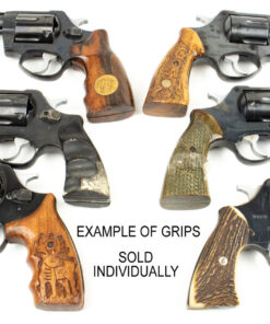 These Good condition M83 revolvers feature one-of-a-kind trench art grips. Every set is unique. The majority of the grips are carved into wood and vary in size and thickness. Additionally, some are carved into plastic, horn, and what appears to be antler. Most of the art appears in the form of wildlife, religious imagery, and vegetation. Some are handcarved target grips. Truly a one-of-a-kind item — we have a limited quantity of these collector’s pieces.